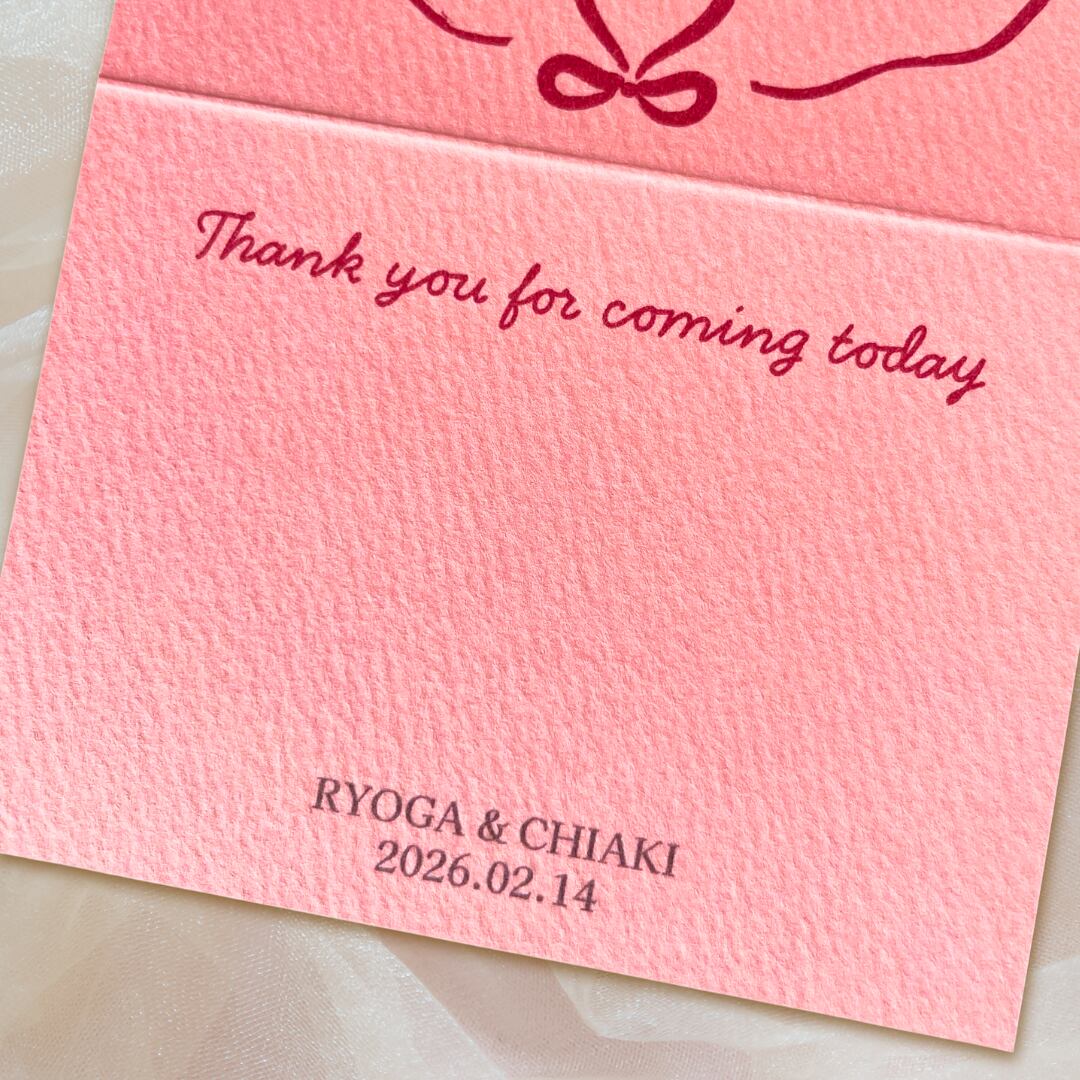"コーラルピンクのマーメイド紙に、赤の筆記体を合わせた